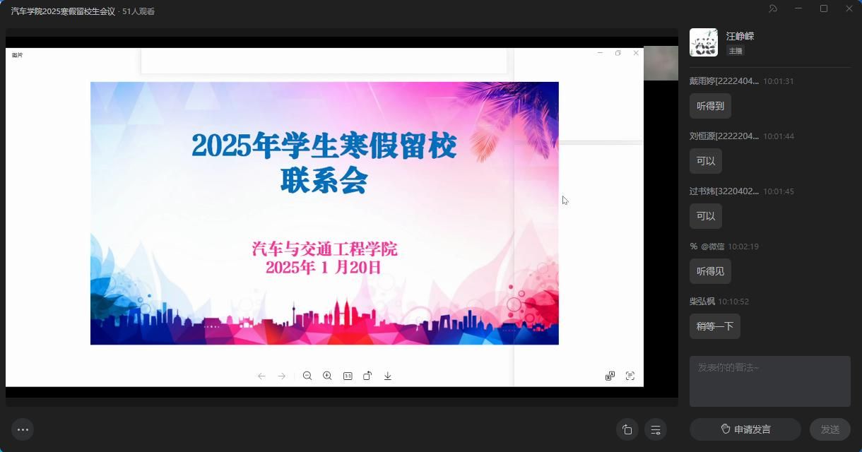 为做好寒假学生的教育管理工作,提高学生安全意识,1月20日,汽车学院线上召开了2025年寒假留校学生会议,全体留校学生、本科生辅导员柴弘枫参加,会议由研究生辅导员汪峥嵘主持。