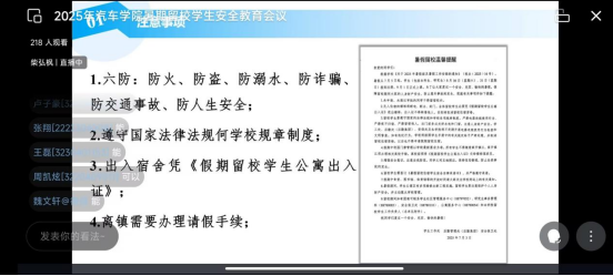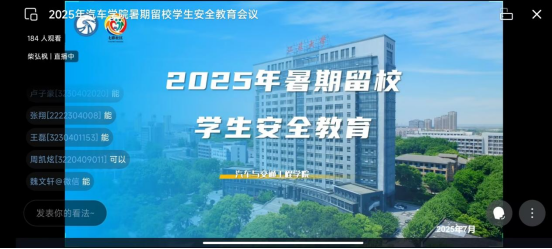 7月4日,汽车学院在线上举办2025年暑期留校学生安全教育会议。本次线上会议由汽车学院研究生辅导员汪峥嵘、汽车学院全体暑期留校学生参加。会议由2023级辅导员柴弘枫主持。