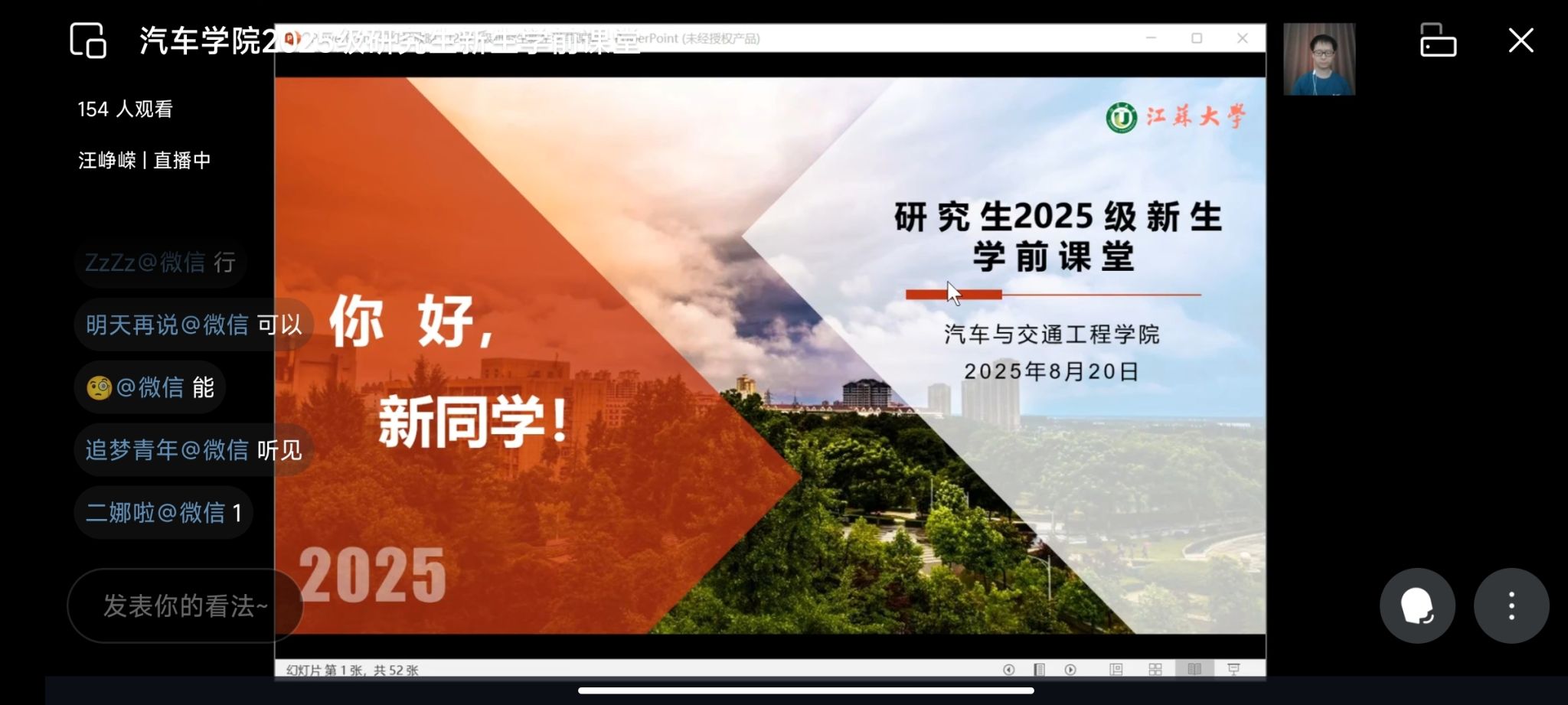 为帮助2025级研究生新生提前熟悉校园生活,进一步提升安全防范意识,8月20日,汽车学院依托企业微信线上平台,举办了2025级研究生新生学前课堂。本次活动由研究生辅导员汪峥嵘主持,汽车学院全体2025级研究生新生齐聚云端,共同开启了一场关于校园学习生活的“导航之旅”。
