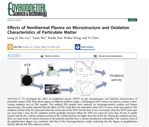 我院蔡忆昔教授课题组在自然指数(Nature Index)期刊 (Environmental Science & Technology)在线发表了题为“Effects of Nonthermal Plasma on Microstructure and Oxidation Characteristics of Particulate Matter”的学术论文,yl6776永利集团为该论文唯一完成单位,这一成果的发表意味着我院动力系的科研水平再次取得重大突破。