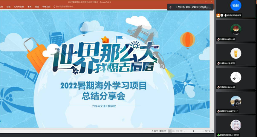 In order to strengthen students' awareness of internationalization and encourage more students to expand their international horizons and participate in overseas learning projects, the School of Automotive and Traffic Engineering held a summary and sharing meeting on the 2022 Student Summer Overseas Learning projects. The meeting was presided over by counselor Yang Yang. Students who participated in the summer overseas study attended the sharing meeting.