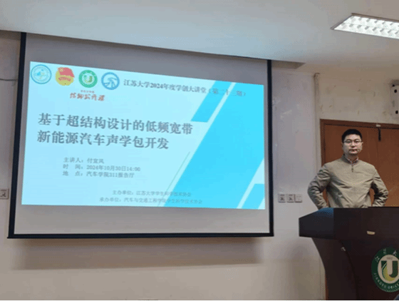 With the rapid development of China's new energy vehicle (NEV) industry, the NVH (Noise, Vibration, and Harshness) performance of vehicles has received increasing attention. The acoustic package system is a crucial component for enhancing vehicle NVH performance, yet the evolution of NEVs poses new challenges for acoustic packages. Acoustic metamaterials offer potential solutions for achieving low-frequency broadband noise control and lightweight design. This report will introduce the basic concepts, application scenarios, and design methods of automotive acoustic packages and acoustic metastructures. The lecture received widespread acclaim from both teachers and students, who listened intently and found it highly engaging. After the lecture, everyone engaged in a lively discussion on the development of low-frequency broadband acoustic packages for NEVs. The lecture received unanimous praise from both teachers and students, and the attendees were fully focused and satisfied.