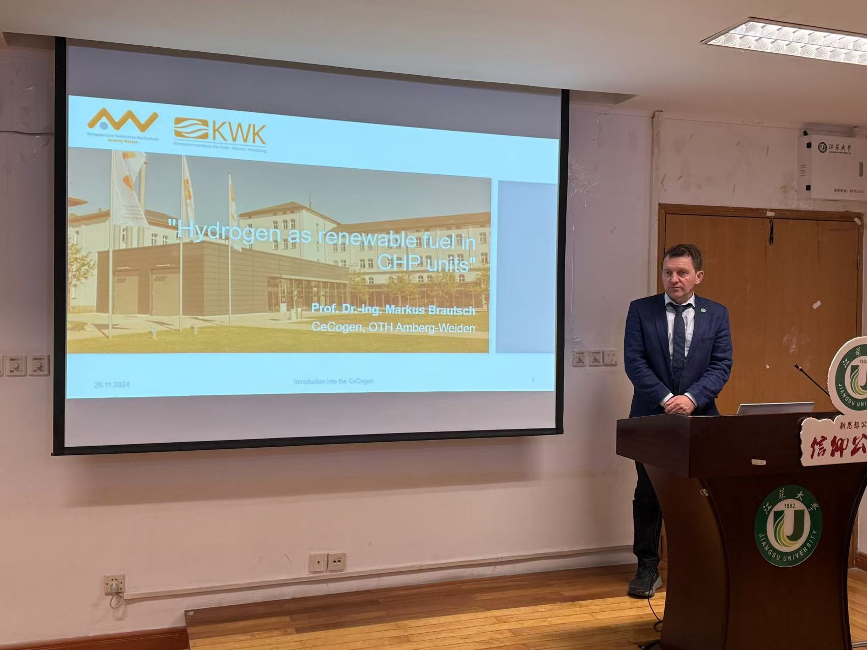 仪式后,我院特邀Günter Elsbett教授为我院学子作题为《氢,一种用于陆海空动力系统的新型燃料》的学术报告,Brausch Markus教授为我院学子作题为《氢在热电联产装置中作为可再生燃料的发展趋势》的学术报告。