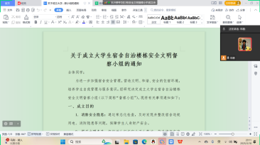 为深化学生自治楼栋自我管理体系,筑牢宿舍安全防线,3月18日,学生自治楼栋委员会通过企业微信线上会议平台召开专题会议,布置成立学生自治楼栋安全文明督察小组工作。楼委会主任丰德、副主任杨扬、楼栋兼职辅导员、楼层长及首批督察小组成员参加会议。