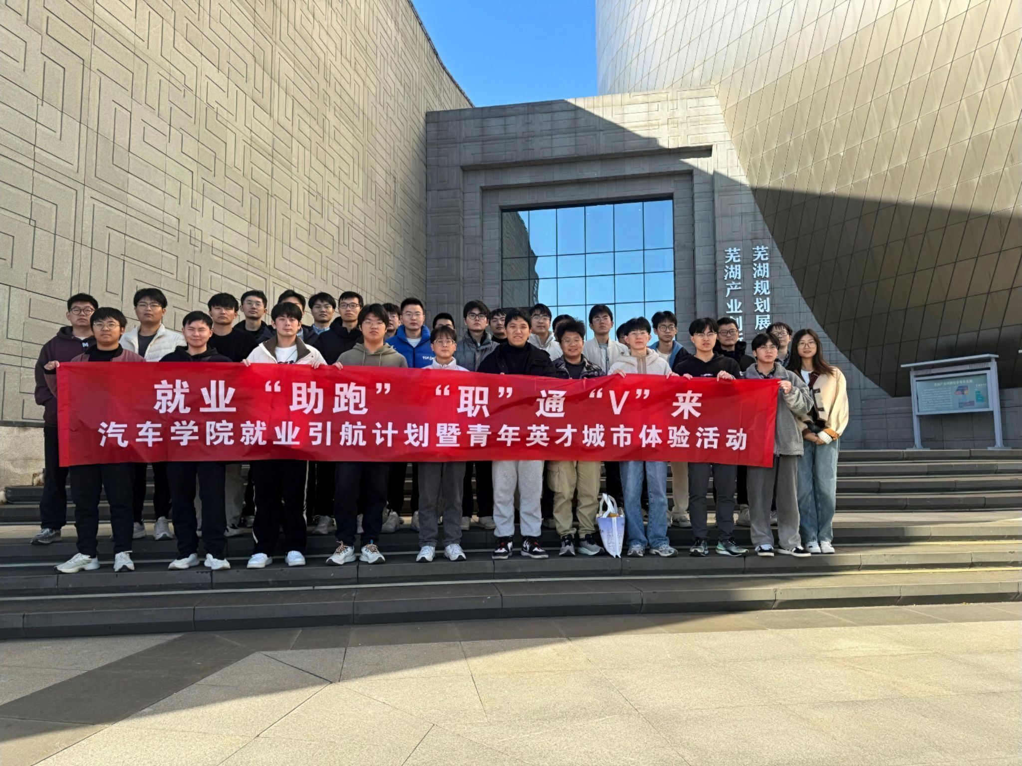 为进一步做好2025届毕业生就业服务工作,搭建学生和企业双向选择的桥梁,以择业新观念打开就业新天地,11月28日-12月1日,汽车学院组织2025届毕业生30人,在辅导员汪峥嵘和王超越的带领下,赴芜湖市参加“芜湖紫云英人才城市体验活动”。此活动由中共芜湖市委组织部(市委人才办)主办,芜湖市人才发展集团承办。