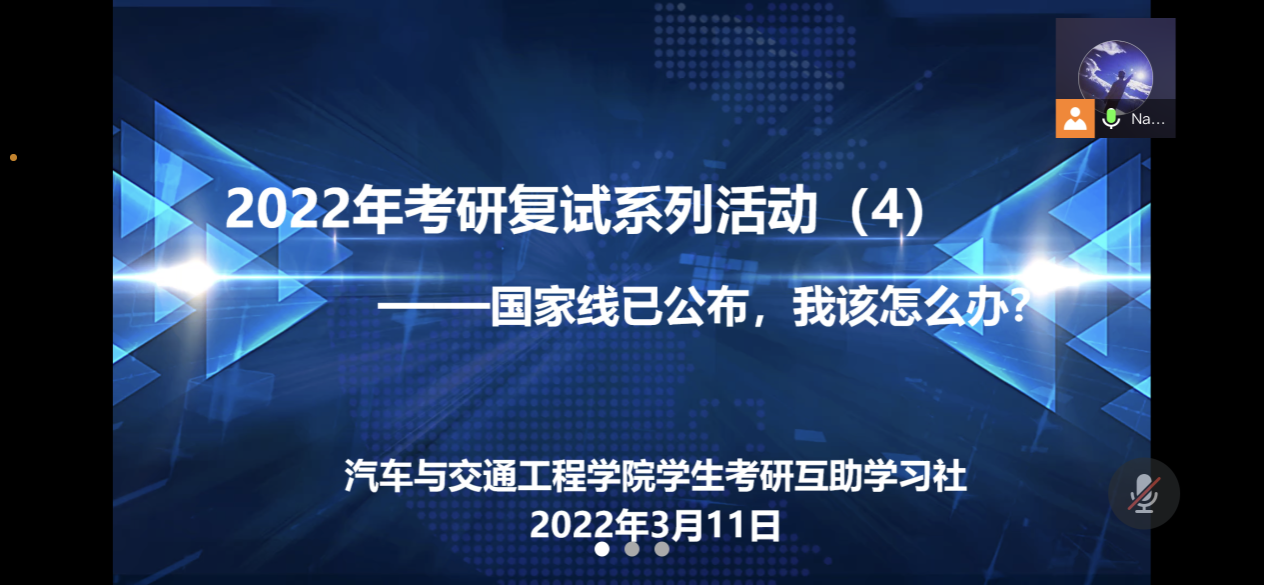 为精准助力考研学子备考,提升学生考研成功率,311日,汽车学院学生考研互助学习社通过腾讯会议APP举办2022年考研复试指导系列活动(4)——国家线已公布,我该怎么办。本次交流会由2018级辅导员刘波涛主讲,130余名考研学生参加。