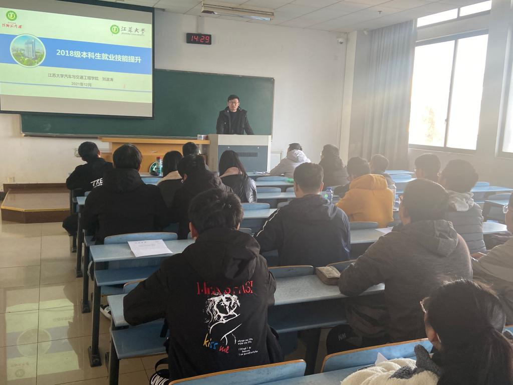 12月3日,汽车学院在三江楼504举办2018级本科毕业生就业创业技能提升讲座,本次讲座由辅导员刘波涛主讲,100余名毕业生参加。