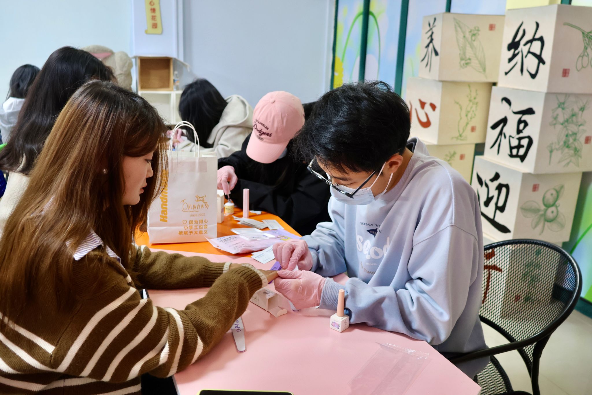 在美甲区,美甲师们围绕女性主题,以春日花卉的清新、几何图案的独立,在指尖上挥洒创意,为女同学们定制专属美甲。大家在享受美甲服务的同时,分享生活趣事,感受节日对女性美的认可与尊重。