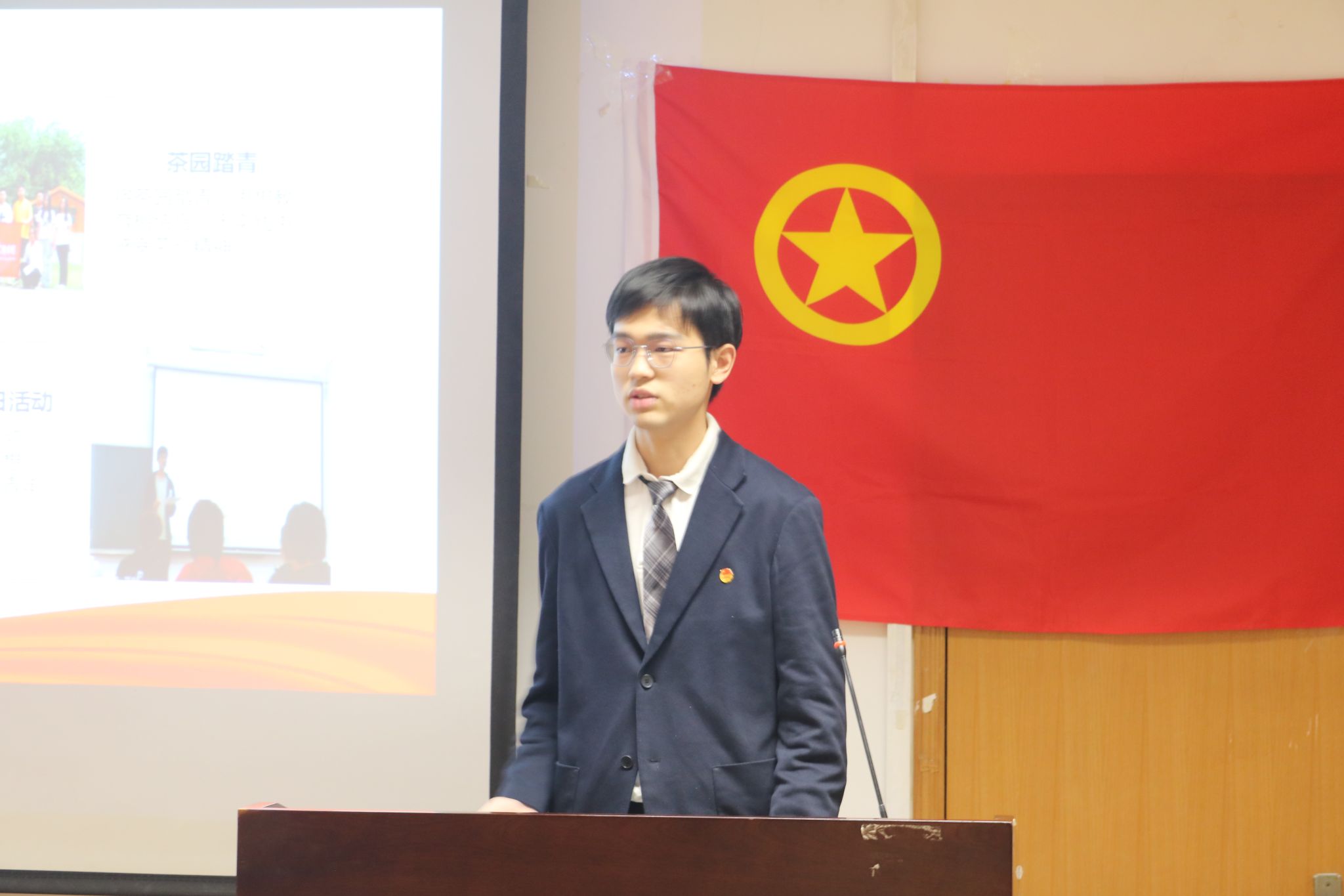 会议伊始,全体参会人员唱团歌《光荣啊,中国共青团》。在团歌结束后由院团委副书记陈佳楠老师带领全体参会人员重温“入团誓词”。