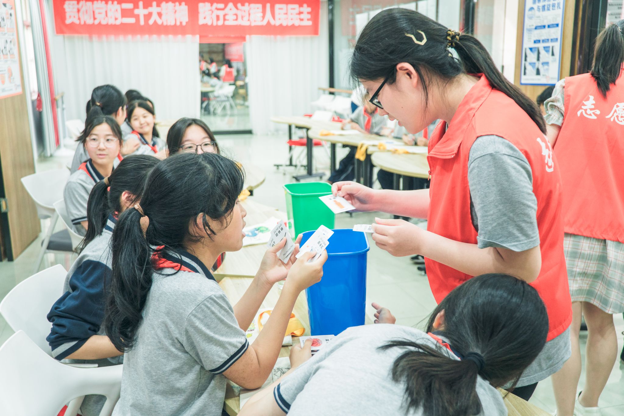 接着,学生们趁热打铁,对自己拿到的垃圾卡片进行了思考和分类,并将卡片投放入对应的垃圾桶,志愿者们在一旁协助,当学生们遇到困惑时及时向他们讲解,共同解决问题。