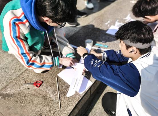 比赛伊始,主持人详细讲解本次比赛的流程安排、评选规则以及注意事项。接着,各参赛小组领取橡皮筋、木棍、纸板等材料,合作完成橡皮筋动力飞机的设计制作。参赛队员们绞尽脑汁,精心设计。最后,每组选手在现场进行飞机试飞,评审小组结合作品外形、飞行时间和飞行距离进行综合评价,评选出优秀作品。