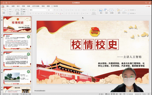 4月3日,由校团委主办,6776永利集团、外国语学院、食品与生物工程学院、化学化工学院、艺术学院和教师教育学院承办的第76期团校第3讲“校情校史”主题团课在线上准时开讲,本次团课由校史馆讲解员王智裕主持,外国语学院、食品与生物工程学院、化学化工学院、艺术学院、汽车学院和教师教育学院的各支部委员、部分团学组织干部及干事参加此次讲座。