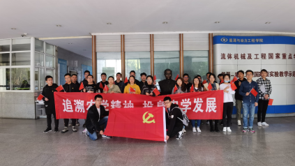 活动第二阶段,党员们在汽车学院本科毕业的“汽车人”带领下参观学习了我国著名农业机械专家、内燃机专家、排灌机械事业的创始人——戴桂蕊教授的生平事迹。同学们在汽车学院大厅内戴老的铜像旁列队,展开鲜艳的党旗,在心中默默许下向戴桂蕊教授学习,为我国农业机械化、智能化而奋斗的誓言。