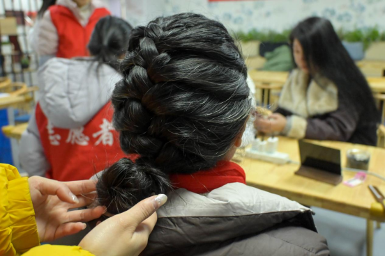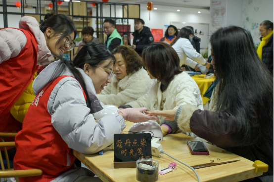 “蔻丹点染时光笺”美甲服务区,志愿者们化身“美甲师”,耐心地为社区阿姨和女孩们涂抹蔻丹,点缀指尖,让平凡的日子也染上靓丽的色彩。“青丝绾就春风结”编发区同样人气高涨,志愿者们手法灵巧,为居民梳理青丝,编出或简约或精致的发型,一绾一结间,绾住了春风,也系紧了邻里情。在“绘影玲珑映流年”摄影区,志愿者们用镜头捕捉居民们的幸福笑颜,定格下一个个温馨美好的瞬间,为他们留下珍贵的时光印记。“竹丝编就玲珑灯”手工体验区则吸引了众多居民动手参与,大家在志愿者的指导下,将一根根竹丝巧妙编织,制作成一盏盏精巧的玲珑灯,感受传统手工艺的魅力和乐趣。
